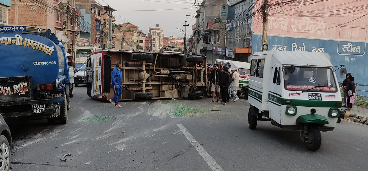 ललितपुर इमाडोलमा बीच सडकमै बस पल्टियो